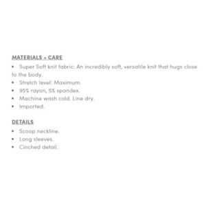 Very soft and stretchy! So versatile and comfy. Also great for layering. Brand new with tags!