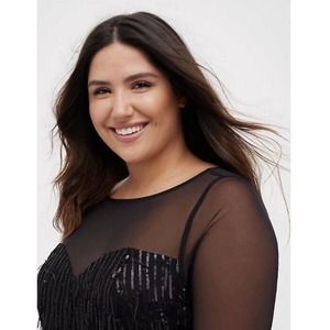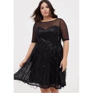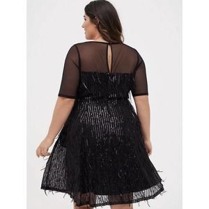 NEW TORRID ILLUSION SLEEVE SKATER DRESS - SEQUIN FRINGE BLACK FLAPPER SIZE 12