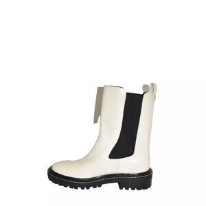 The combination of white and black Vachetta calf leather with a colorblock pattern and the iconic TB logo accent on the heel adds to its designer appeal. These boots are perfect for any occasion, be it travel, casual, formal, or business.