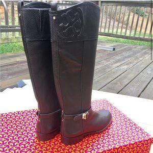 New Tory Burch Marlene Riding Boots- Tumbled Leather, Color is Coconut (dark brown). The Perennially Chic Riding Boots step out in textured Leather with Logo details at the ankle and cuff a signature finish. An essential wardrobe piece. Know for rich color, bold print and clean, graphic lines TORY BURCH designs have been making a splash since the brand debuted in 2004- Always embodying the designer's own inimitable style and sensibility. Size; 9.