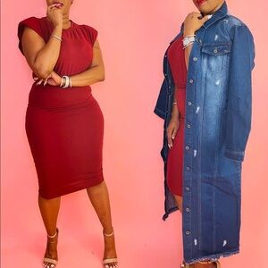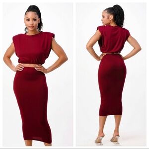 NEW TRENDY BURGUNDY TWO PIECE SHOULDER PAD CROP TOP SHIRT MIDI CALF SKIRT SET