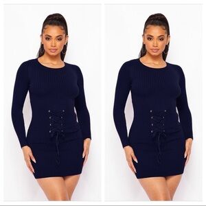 NEW TRENDY NAVY BLUE RIBBED LONG SLEEVE KNIT FRONT LACE UP WAIST BELT MINI DRESS
