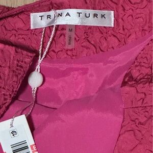 The NEW Trina Turk Bellamy Mini Dress in Pink with Flutter Sleeves is a stylish one-piece option for women in a size medium. The regular fit silhouette features a flattering bellamy style with a fun and feminine pink color, making it a perfect choice for various occasions. The flutter sleeves add a touch of elegance to this fashionable dress from Trina Turk.