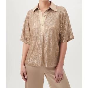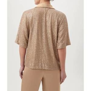 Short-sleeve top featuring a contrast satin collar and front half placket, a polo-inspired design, and a relaxed fit. Short dolman sleeves. Boxy fit. Mesh: 92% Polyester, 8% Spandex. Sequin: 100% Polyethylene Terephthalate. Dry clean only. Imported.