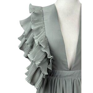 This exquisite evening gown, draped in a captivating sage green hue, is a testament to elegance and sophistication. With its cascading ruffled sleeves and deep V-neckline, it captures an essence of timeless beauty. The flowing silhouette flatters the figure while exuding a sense of grace and refinement, making it an ideal choice for formal gatherings.
