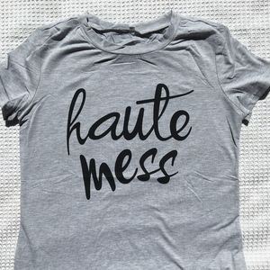 This fashion forward "haute mess" t-shirt has a round neck and short sleeves. It is grey cotton and the material has a little stretch.