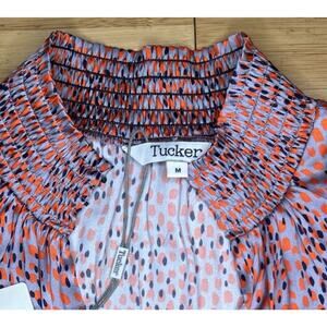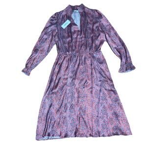 Stunning Tucker NYC silk dress in size Medium. Vibrant abstract micro print with red, pink, and purple tones. Flattering elastic waist, long sleeves, and a modern smocked mock neckline. Made of luxe stretch silk for a perfect blend of comfort and sophistication. Ideal for workwear, brunch, or date nights. Excellent pre-owned condition, no flaws. Boutique designer quality that fits multiple aesthetic vibes from office siren to indie sleaze.