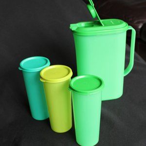 NEW - TUPPERWARE Beverage Set, Includes; 2Qt slim refrigerator pitcher, 3-16 oz tumblers with seals. Green, blue, yellow