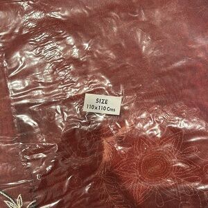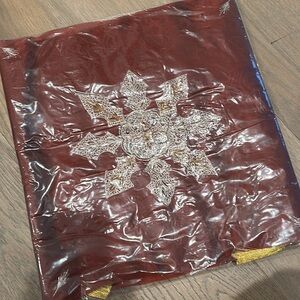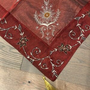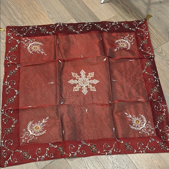 Brand new, still in bag (first time removed from bag was to take these pictures). Sheer organza type table covering with decorative stitching and beads. Each corner has tassel. Measures approx 43”square. Authentic made in India. Note- I have a few other listings for similar tablecloths.