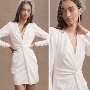 NEW Tadashi Shoji Sabine Plunge V-Neck Twist-Front Long-Sleeve Mini Dress White