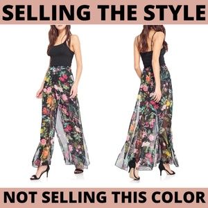 Our wide-legged pants are the height of sophistication. Painterly floral prints grace the slacks. An additional overlay of crinkle chiffon completes the modern style.