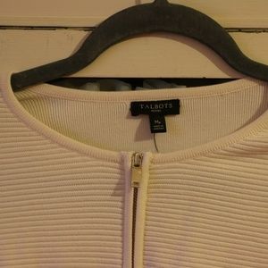 New with all of the original tags still attached. There is a very soft ribbed front and the zipper goes all the way down the front. There is no hood and there is a round neckline.