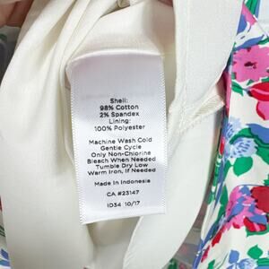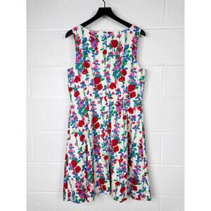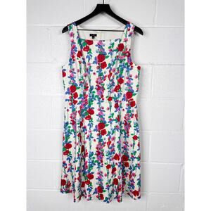 Talbots sleeveless fit and flare dress in size 12 featuring a white background with bold multicolor floral print and back zip closure.