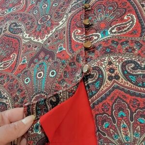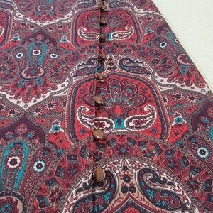 Elevate your wardrobe with this stylish paisley patterned skirt. Featuring a vibrant red design, it's perfect for any occasion. Decorative front buttons on the front offset to one side. Lined. Zipper and hook closure.