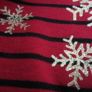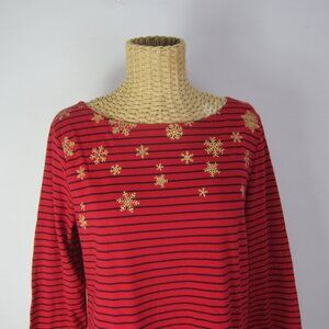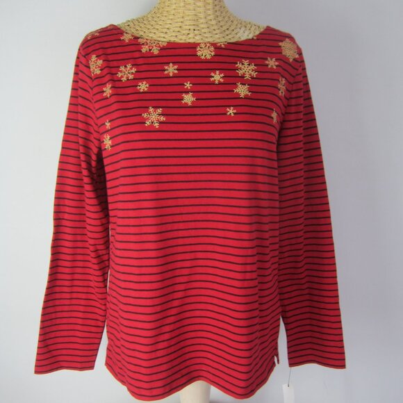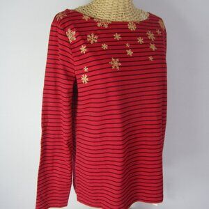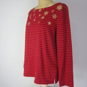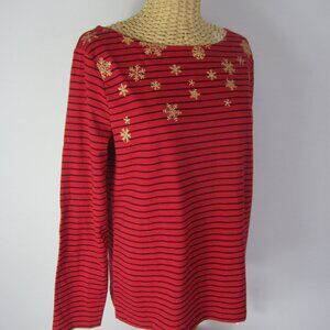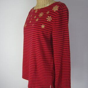 NEW Talbots Women Petite Medium PM Red Black Gold Stripe Snowflake Shirt NWT $45
