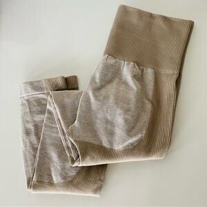 NEW Tan Cream Beige Colorblock Stripe Cutout Ribbed Knit High Rise Leggings L