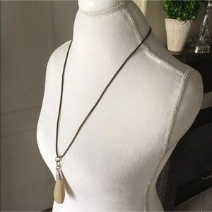 NEW Unique Large Teardrop Pendant Statement Necklace Boho Beige Taupe on Brown Wax Cord. Resin pendant measures approx. 4 1/2” long and is on a brown cord with a drop of approx. 14” when fastened on base loop. Extender adds 2 1/2”. Lobster clasp.