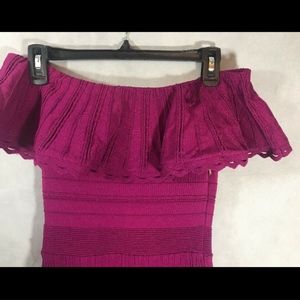 Dimensional texture defines a shoulder-baring stretch-knit skater dress topped with a flirty, fluttering ruffle.
