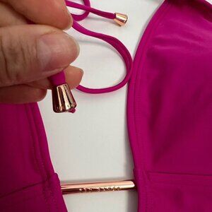 Get ready to hit the beach in style with this stunning Ted Baker Nesira one-piece swimsuit. The vibrant fuchsia pink color and elegant logo accents make this swimsuit a must-have for any fashion-forward woman. The bikini top with spaghetti straps and adjustable backless design provides a comfortable and supportive fit, while the Brazilian bottoms add a touch of sexiness to the overall look.
