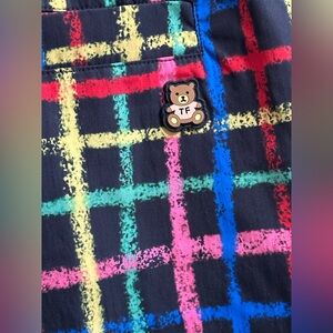 Brand new with tags, never worn. These bold Teddy Fresh shorts feature a vibrant checkered crayon design against a dark black background. Designed for comfort and versatility, they have an elastic waistband with an adjustable drawstring, functional mesh-lined pockets, and the signature TF Teddybear logo on the rear pocket. The lightweight, linerless construction makes them perfect for lounging, swimming, outdoor activities, or boating.