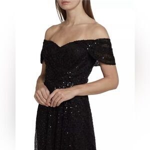 Teri Jon by Rickie Freeman Sequin Mesh Midi Dress. This dress is decorated with sparkling sequin embellishments. Showcasing an elegant off-the-shoulder neckline, this glamorous style is detailed with short sleeves and an A-line skirt with a pencil underlay.