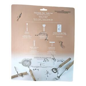 Make the most of your holiday drinks this season with this essentials bar tool set with rattan wicker design and storage bag. The set inlcudes a stirrer, strainer, cotton canvas storage bag, bottle opener, and corkscrew. All tools are made of stainless steel, beechwood, and rattan wicker. Handwash only.
