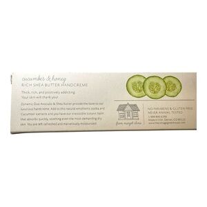 NEW in Box! Never opened or used. Cucumber and Honey Rich Shea Butter Hand creme From The Cottage Greenhouse by Margot Elena Thick, rich, and positively addicting. Your skin will thank you! Dynamic Duo Avocado Oil & Shea Butter provide the base to our luxurious handcreme. Add to this natural emollients Jojoba Oil & Cucumber Extracts, and you have our irresistible botanic balm that absorbs quickly, soothing even the most demanding dry skin. You are left refreshed and marvelously moisturized. FRAGRANCE NOTES Cucumber & Honey GOOD TO KNOW Paraben Free / Gluten Free / Never Animal Tested / Sulfate Free Mother Nature Knows Best Cucumber is nature’s emollient, a sparkling tonic used to soften and soothe stressed skin. Cool as a cucumber, it gives you the quenching boost your skin needs to look its healthy best. Made With: Cucumber Extract, Honey, Avocado Oil, Shea Butter, Jojoba Oil, Aloe Leaf, Macadamia Oil SPECIFICATIONS Box: 2" SQ x 7" L Tube: 2.25" W x 6" L Fill Weight 4 oz / 113 g 🌸 Bundle 2 or more items to receive a! 🌿 Reasonable offers welcome! 🌸 All orders shipped same day or next business day. Tags: