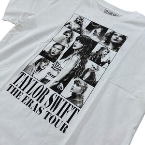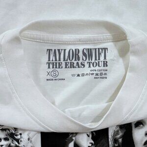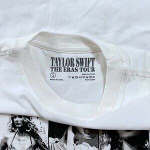 White t-shirt featuring "Taylor Swift | The Eras Tour" and photos printed on front.