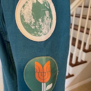 Logo on left chest pocket and back-right shoulder; logo patch on right sleeve and two Earth graphic patches on left sleeve
