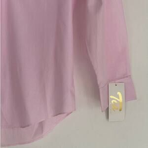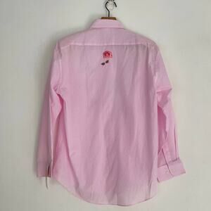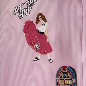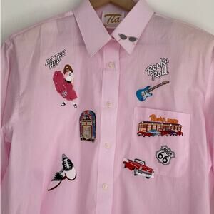 This Tia top is vintage and never worn with tags, features a pink color, button down front, long sleeves, and 80’s sockhop patchwork.