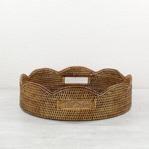 Bring a touch of artisanal charm to your home with this small, round tight woven rattan tray, featuring delicately scalloped edges. Perfect for adding a natural aesthetic to your décor, this tray is ideal for organizing small items or serving drinks with style. Handcrafted with care, it's a versatile and sustainable addition to any eco-conscious household.