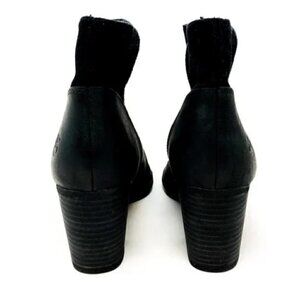 Black distressed leather and soft suede upper with a stacked heel and almond toe.