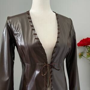New without tags Darted and Structured Longline Hourglass Open Front Jacket by To The Max. Super Cute Vintage 90s Faux Leather and Velvet Whipstitched Construction. Long Sleeves. Single Tie Closure at Waist. Collarless Deep V Plunge Front. Glossy Dark Chocolate Brown. Women’s Size Small.