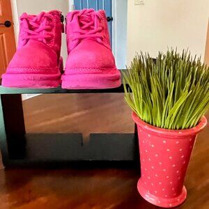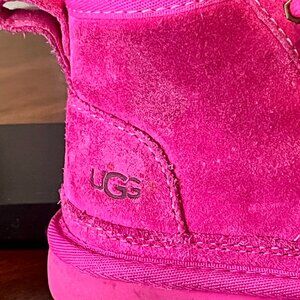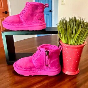These NEW toddler UGG ankle boots in size 10 are a stylish and practical choice for toddler girls. The pink boots feature a water-resistant design, perfect for keeping feet dry in wet weather. The zippered closure makes them easy to put on and take off, while the classic chukka style adds a touch of sophistication to any outfit. With their durable construction and comfortable fit, these UGG boots are a must-have for any little girl's shoe collection. New without box.