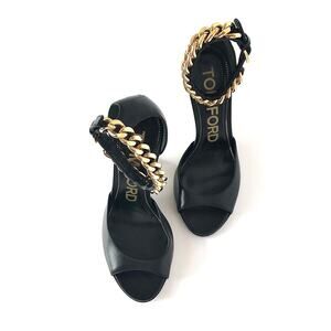NEW Tom Ford Gold Chain Wedge Black Leather Heeled Sandals 37.5