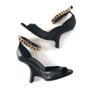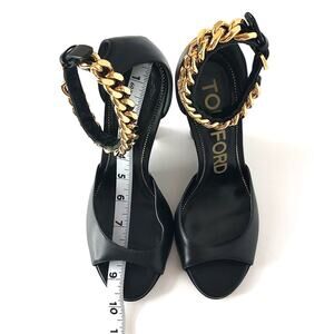 NEW Tom Ford Gold Chain Wedge Black Leather Heeled Sandals 37.5