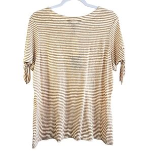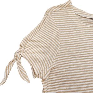 This adorable Tommy Bahama 100% woven linen tee has classic tan & white stripes and cute ties on the sleeves.
