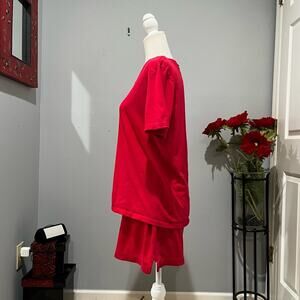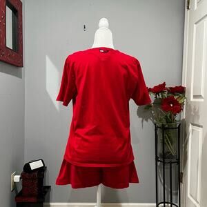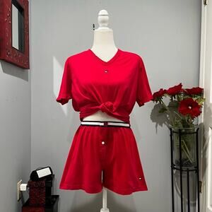 NEW Soft and Casual Relaxed Cotton Vintage High Waisted Boxer Style Sleep Shorts with Contrasting Elasticized Waistband and Oversized Short Sleeve V-neck Boxy Sleep Top Sleepwear Set by Tommy Hilfiger. Red with Blue and White Logo and Contrasting Details. Hilfiger Flag Logo on Front of Shorts and Tops, and Logo Tags on Back. Some Stretch. Women’s Size Large.