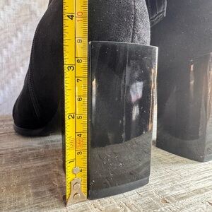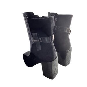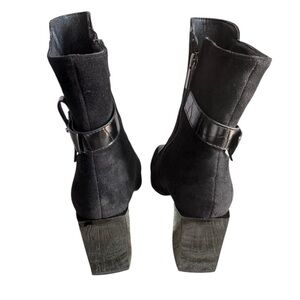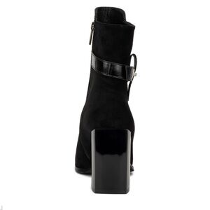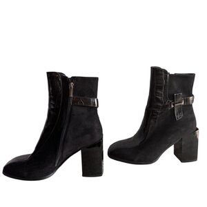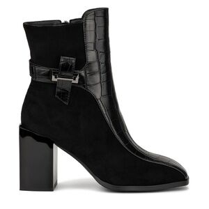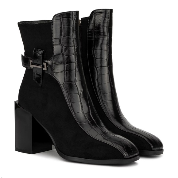 Featuring a chic embossed faux croc panel and a distinctive ankle buckle detail, these boots exude style and sophistication. The unique set back stacked heel adds a modern twist, making them truly one of a kind. Crafted with soft faux suede, a durable rubber sole and a plush fabric lining, these boots offer both comfort and durability, making them the perfect statement piece for any outfit.