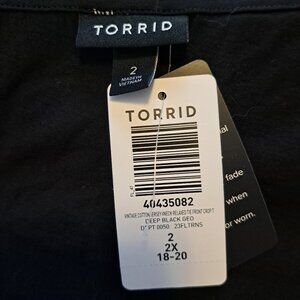 Brand new top from Torrid. Black with white geometric print, V neckline that ties in the front, and a soft jersey knit material. Torrid size 2; measures about 24 inches between the pits and 27 inches long. Lightweight, soft and stretchy.