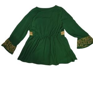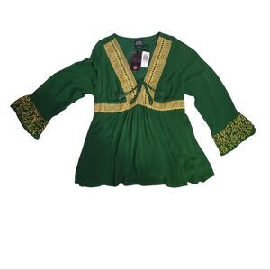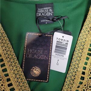 NWT Torrid green Warner Bros House of the Dragon Game of Thrones babydoll crinkle gauze gold embroidered blouse. Medieval renaissance style. Lace up front and bell sleeves. This would be great for St Patricks Day! Fully lined. Rayon.
