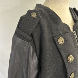 Bundle up with a structured military-inspired coat that features contrast faux leather sleeves. Includes stretch knit paneling under the sleeves for a perfect fit. All black herringbone design and military-style buttons complete the look.