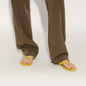 Yellow flip-flops from Tory Burch. Made of leather, this model sits on a light beige leather sole and features a gold-tone logo application on the front.