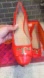 Featuring a polished 'T' framed in metal on a juicy red orange color leather.  Almond shaped toe. Block pump heel. Size 9.5. New in box.  I just cleaned the sticker on the bottom a bit so you could see.