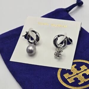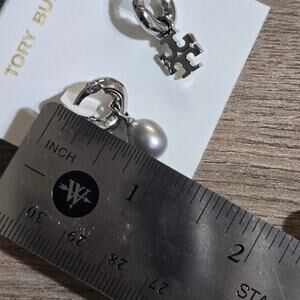 NEW Tory Burch KIRA PEARL DROP EARRINGS Silver T Logo Dangling Small Chunky Gift
