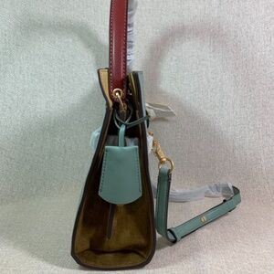 Adjustable, removable crossbody strap with 14.3" (36 cm) drop 5 interior compartments (1 center zipper compartment, 4 open compartments), 1 side wall zipper pocket, 1 side wall slit pocket