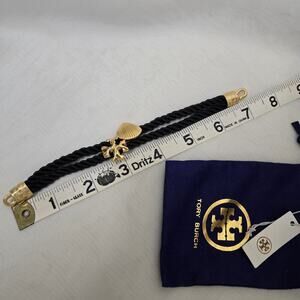 This brand new bracelet features the iconic Tory Burch shell logo, beautifully crafted with 18K gold plating. The black rope detail adds a bold, summery touch, perfect for beach days or adding a chic accent to any outfit.