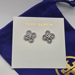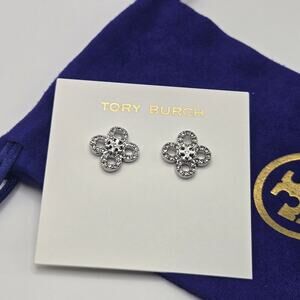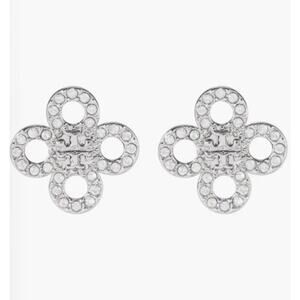 NEW Tory Burch Small Kira Pave Clover Stud Earrings Light Hematite Crystal Logo
