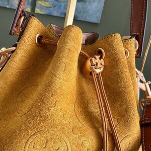 NEW! Tory Burch T-Monogram SUEDE EMBOSSED Bucket -large Claret (Deep Sunflower)