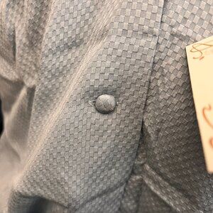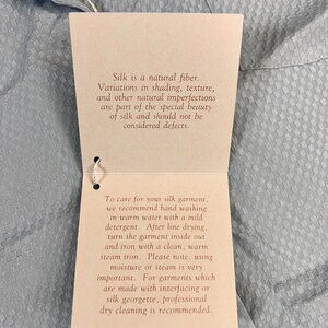 Soft and silky 100% silk sleep shirt. This is a short sleeve mid length sleep shirt or nightgown. It has a checkered basketweave pattern on the fabric but is a solid light soft blue. Collar with full button down.